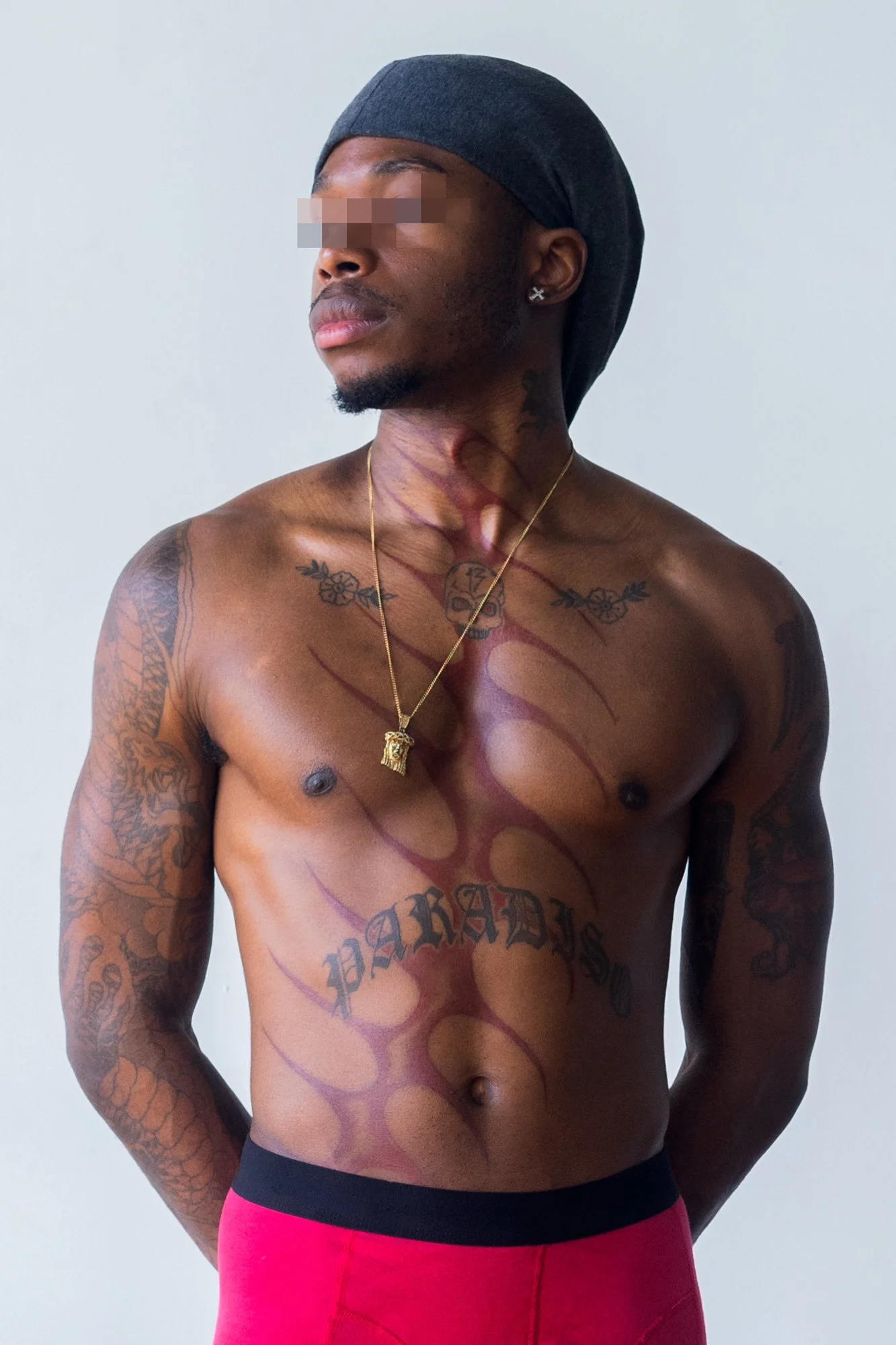 large color abstract back piece blast over tattoo on a rooftop in Brooklyn overlooking New York City